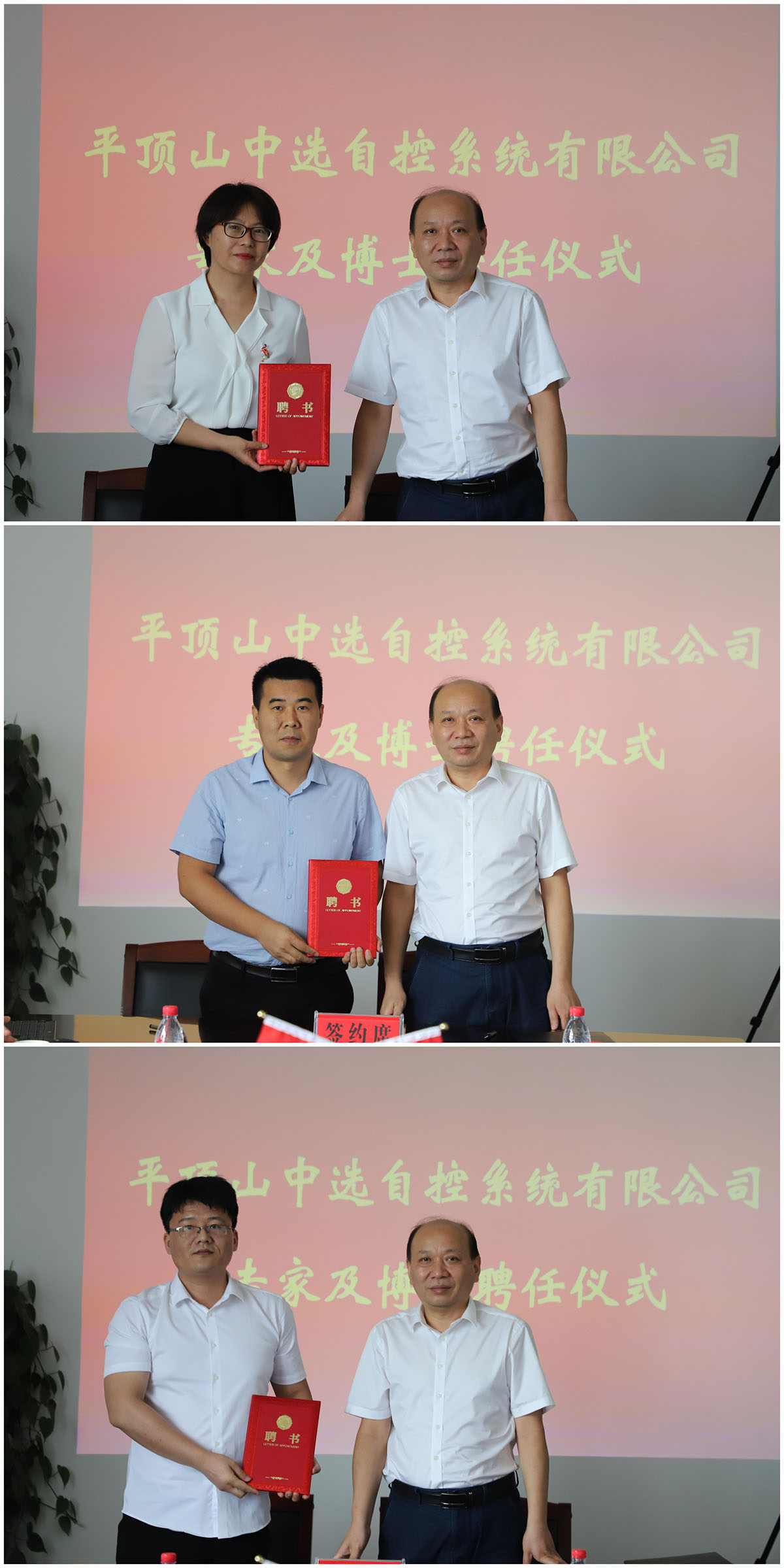 中選自控系統(tǒng)有限公司總經(jīng)理王巍與受聘專(zhuān)家簽署聘任協(xié)議,為董燕飛院長(zhǎng)、梁成武博士、司文杰博士頒發(fā)聘任證書(shū)。
