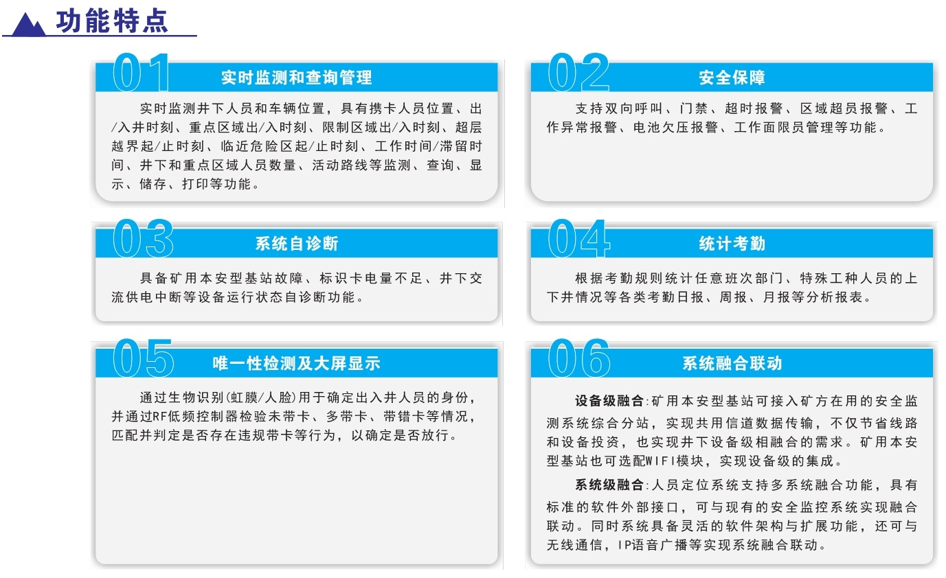 產(chǎn)品簡介:KJ2356J煤礦井下人員精確定位系統(tǒng),采用超寬帶無線(UWB)、慣性測量單元(IMU)、到達(dá)時(shí)差法(TODA)等多源融合定位方法,實(shí)現(xiàn)井下移動(dòng)目標(biāo)定位精度小于0.3米的井下類GPS系統(tǒng)。該系統(tǒng)不僅強(qiáng)化了人員位置的精準(zhǔn)感知,實(shí)現(xiàn)煤礦井下作業(yè)人員位置的監(jiān)測管理、報(bào)警、各類數(shù)據(jù)查詢及報(bào)表功能。同時(shí)支持與車輛定位融合,將精準(zhǔn)定位技術(shù)應(yīng)用到井下機(jī)車、采掘裝備等各類設(shè)備。該系統(tǒng)具有定位精度高、抗干擾能力強(qiáng),系統(tǒng)容量大、安裝使用簡便等特點(diǎn),對煤礦高效生產(chǎn)和應(yīng)急教援具有十分重要的意義。該系統(tǒng)不僅強(qiáng)化了人員位置的精準(zhǔn)感知,實(shí)現(xiàn)煤礦并下作業(yè)人員位置的監(jiān)測管理、報(bào)警、各類數(shù)據(jù)查詢及報(bào)表功能。同時(shí)支持與車輛定位融合,將精準(zhǔn)定位技術(shù)應(yīng)用到井下機(jī)車、采掘裝備等各類設(shè)備。