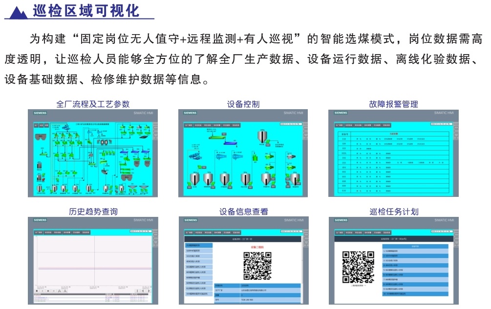 產(chǎn)品簡介:構(gòu)建“固定崗位無人值守+遠(yuǎn)程監(jiān)測+有人巡視”的智能選煤模式,崗位數(shù)據(jù)需高度透明,我公司提出用觸摸屏代替?zhèn)鹘y(tǒng)控制箱,通過觸摸屏與管控平臺的對接,讓巡檢人員能夠全方位的了解全廠生產(chǎn)數(shù)據(jù)、設(shè)備運行數(shù)據(jù)、離線化驗數(shù)據(jù)、設(shè)備基礎(chǔ)數(shù)據(jù)、檢修維護(hù)數(shù)據(jù)等信息。建立智能啟停車診斷系統(tǒng),充分利用集控系統(tǒng)、配電系統(tǒng)、視頻分析系統(tǒng)、設(shè)備預(yù)測性維護(hù)系統(tǒng)、檢修任務(wù)進(jìn)度等信息,建立啟停車前人機(jī)環(huán)境評估、生產(chǎn)過程異常數(shù)據(jù)分析以及發(fā)現(xiàn)問題后的消息推送與執(zhí)行策略。